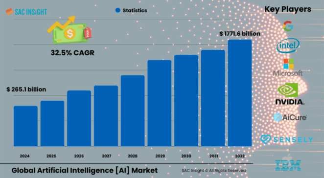 The Global artificial intelligence [AI] market is set to continue its rapid growth trajectory. With the global market size estimated at USD$ 265.12 billion in 2024, our analysis expects the sector to reach USD$ 1,771.62 billion by 2032, advancing at a powerful 32.55% CAGR over the forecast period. The widespread adoption of AI technology is driven by increased enterprise use of generative models, the expansion of cloud deployments, and substantial government investments. In North America, the U.S. artificial intelligence [AI] market alone is anticipated to grow from US$ 23.8 billion in 2025 to approximately US$ 399.22 billion by 2032, as businesses aim to integrate intelligent automation into their operations.