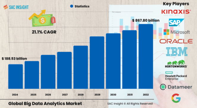 The big data analytics market size was valued at US$ 188.53 billion in 2024 and is projected to reach roughly US$ 867.80 billion by 2032, advancing at a 21.1% CAGR over 2026-2032. First-hand industry insights highlight three powerful tailwinds: an explosion of machine-generated data, rapid enterprise cloud migration, and the race to embed generative AI into everyday decision-making. SAC Insight evaluation shows predictive analytics commanding over 32% of 2024 revenue as businesses shift from hindsight to real-time intelligence. Although specific figures for the U.S. market size by 2032 are limited, the region is anticipated to maintain strong momentum buoyed by early adoption across finance, healthcare, and e-commerce.