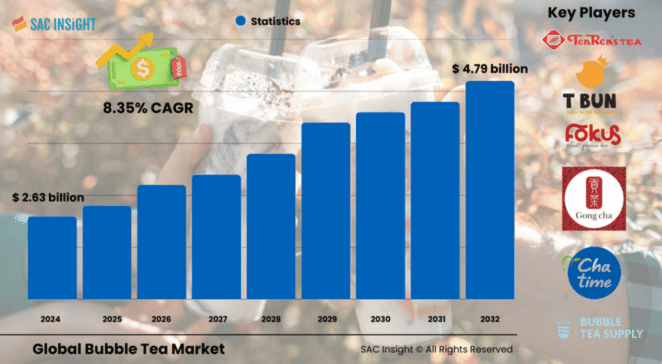 The bubble tea market size stands at US$ 2.63 billion in 2024 and, according to SAC Insight analysis, is projected to hit US$ 4.79 billion by 2032, advancing at a compound annual growth rate (CAGR) of 8.355% over 2020‑2032. First-hand industry insights point to three powerful growth engines: rising demand for low-fat “occasion” drinks among Gen Z, a rapid store-opening cycle outside Asia, and a wave of better-for-you recipes featuring reduced sugar and plant-based creamers. The U.S. bubble tea market is on track to approach US$ 1.9 billion by 2032, reflecting a steady uptick in specialty café traffic and ready-to-drink (RTD) launches.