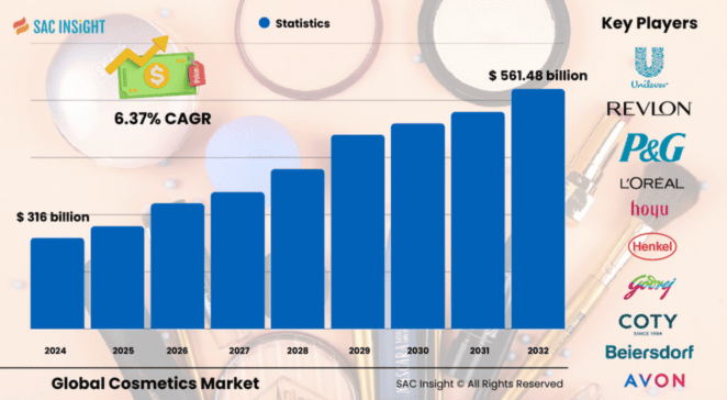 The global cosmetics market size stood at USD$ 316 billion in 2024 and is projected to exceed USD$ 561.48 billion by 2032, advancing at a CAGR of 6.37%. during the forecast period. These figures emerge from SAC Insight analysis that considers evolving consumer behaviors, rising disposable incomes, and intensifying attention to personal health and well‑being. Enhanced product innovation—especially for natural or eco‑friendly formulas—has played a crucial role in boosting consumer engagement. Notably, the U.S. cosmetics market alone is poised to approach US$ 100 billion by 2032, buoyed by robust demand for multi‑functional skincare and hair care lines.