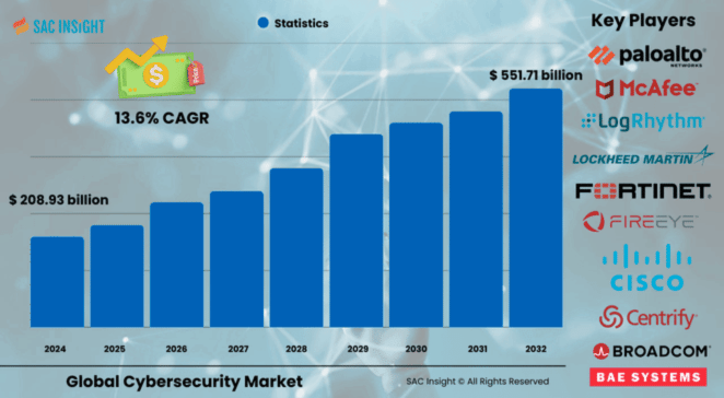 The cybersecurity market size was valued at US$ 208.93 billion in 2024 and is set to accelerate roughly US$ 551.71 billion by 2032, reflecting a healthy 13.6% CAGR. SAC Insight evaluation shows three structural drivers: relentless growth in connected devices, a sharp rise in sophisticated ransomware and phishing campaigns, and board-level focus on regulatory compliance. First-hand industry insights also point to a lasting shift toward cloud-delivered protection as hybrid workforces become the norm. The U.S. cybersecurity market alone is projected to top US$ 166.73 billion by 2032 on the back of high e-commerce penetration and stringent federal mandates. North America is expected to command roughly 39% market share by the end of the period, underscoring the region’s continued technology leadership.