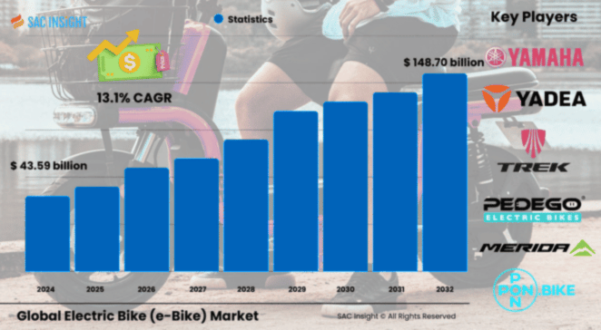 The electric bike market size was valued at US$ 43.59 billion in 2024 and is projected to reach about US$ 148.70 billion by 2032, expanding at a 13.1% CAGR during the 2025‑2032 forecast window. This robust market growth is powered by first-hand industry insights pointing to three clear factors: urban commuters seeking affordable, low-emission mobility; governments rolling out purchase incentives and cycling-lane networks; and steady advances in lightweight batteries and connected-bike systems. SAC Insight evaluation also shows the U.S. ebike market heading toward roughly US$ 2.83 billion by 2032 as fitness-oriented riders, delivery fleets, and micromobility apps converge on two-wheel electrification.