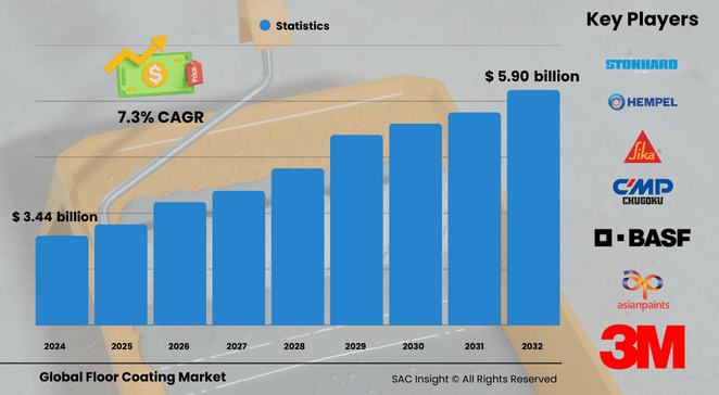 The global floor coating market size is valued at roughly US$ 3.44 billion in 2024 and is projected to reach approximately US$ 5.90 billion by 2032, expanding at a 7.35% CAGR across the 2025-2032 forecast window. First-hand industry insights highlight three structural growth engines: a global construction up-cycle, tougher hygiene, and safety regulations in industrial settings, and rapid product innovation that cuts installation downtime.