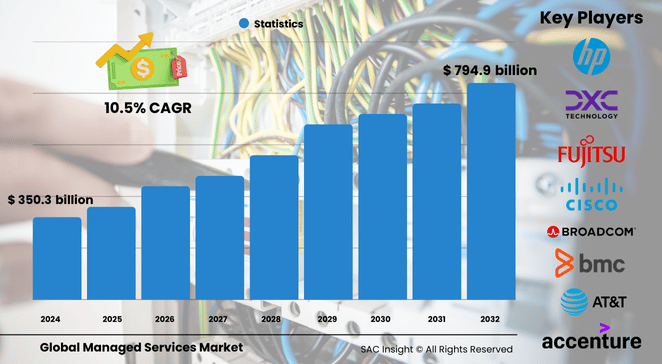 The global managed services market size was valued at US$ 350.35 billion in 2024 and is projected to reach roughly US$ 794.99 billion by 2032, registering a 10.5% CAGR over the 2025-2032 forecast window. First-hand industry insights highlight four structural growth engines: relentless cloud and hybrid-infrastructure adoption, rising cyber-threat complexity, pressure to trim IT operating costs, and growing demand for 24/7 expert support.