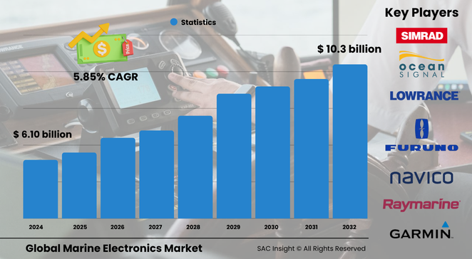 Global market analysis shows the marine electronics market size stood near US$ 6.10 billion in 2023 and is projected to reach roughly US$ 10.03 billion by 2032, expanding at a steady 5.85% CAGR. First-hand industry insights point to accelerating maritime trade, electronics-rich fleet modernisation, and the shift toward autonomous and connected vessels as the core engines of market growth. SAC Insight's deep market evaluation indicates the United States alone could advance from about US$ 2.37 billion in 2024 to around US$ 3.72 billion by 2032 as regulatory focus on safety and sustainability intensifies.
