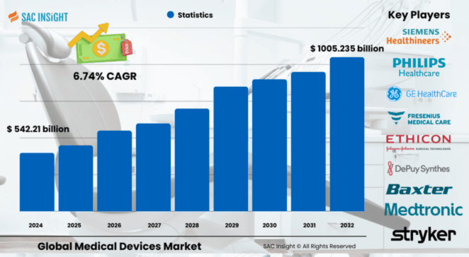 The global medical devices market size was valued at USD$ 542.21 billion in 2024 and is projected to reach USD$ 1,005.235 billion by 2032, registering at a CAGR of 6.745% over the forecast window. First-hand industry insights highlight three structural forces behind this market growth: a swiftly aging population, a surge in chronic-disease diagnostics, and rapid integration of digital and minimally invasive technologies. SAC Insight evaluation also confirms North America’s leadership, with the U.S. medical devices market forecast to exceed roughly USD$ 349 billion by 2032 as hospitals accelerate adoption of AI-enabled imaging and connected care tools.
