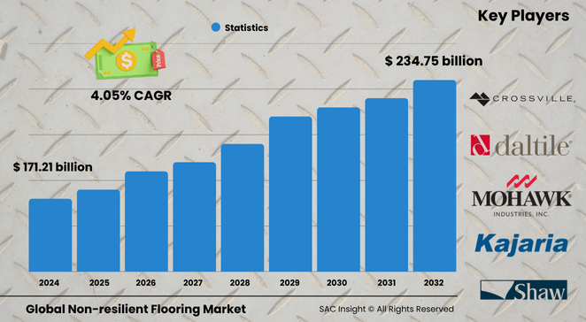 The global non-resilient flooring market size is valued at about US$ 171.21 billion in 2024 and is projected to reach nearly US$ 234.75 billion by 2032, posting an average 4.05% CAGR through the 2025-2032 forecast window. SAC Insight's first-hand industry insights reveal three structural growth engines: accelerating construction in emerging economies, steady uptake of stone and ceramic alternatives for premium aesthetics, and rapid innovation that shortens installation time while extending product life.