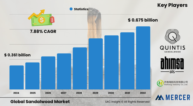 The global sandalwood market size is valued at roughly US$ 0.361 billion in 2024 and is projected to reach about US$ 0.675 billion by 2032, expanding at an average 7.88 % CAGR. SAC Insight's first-hand industry insights highlight three clear growth engines: a surge in demand for natural fragrances, wider therapeutic use in aromatherapy and topical remedies, and heavy investment in sustainable plantations to ease supply constraints. SAC Insight's deep market evaluation shows the United States sandalwood market alone could advance toward the US$ 0.12 billion mark by 2032 as premium personal-care brands push for traceable, high-purity oil.