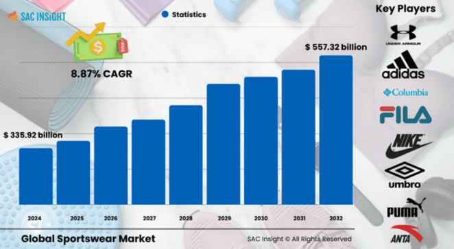The global sportswear market size was valued at US$ 335.92 billion in 2024 and, according to our latest market analysis, is projected to reach at US$ 557.32 billion by 2032, expanding at a (CAGR) of 8.87% over 2026-2032. First-hand industry insights point to three structural tailwinds: a worldwide shift toward active lifestyles, the crossover appeal of athleisure, and rapid digital-commerce penetration. SAC Insight evaluation also highlights a decisive rebound from pandemic disruptions, with demand outstripping 2019 levels across most regions. The U.S. sportswear market is on track to approach US$ 198.89 billion by 2032, driven by high disposable incomes and a vibrant sports culture.