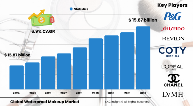 The global waterproof makeup market size is valued at about US$ 15.87 billion in 2024 and is projected to reach roughly US$ 27.82 billion by 2032, charting a steady 6.9% CAGR through the 2025-2032 forecast window. SAC Insight's first-hand industry insights point to three clear growth engines: consumers’ preference for stay-put cosmetics in humid or active settings, ongoing R&D that blends film-forming polymers with skin-care actives, and social-media amplification of long-wear performance claims.